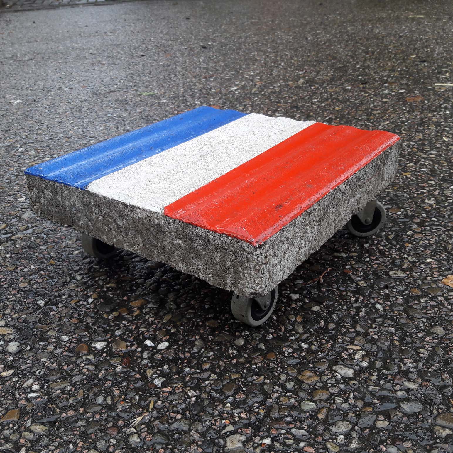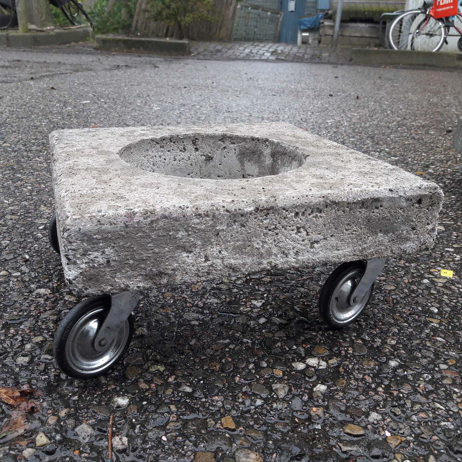 - ART… NO WASTE. Rolling stone on wheels. 30 x 30 cm. square. 165,-